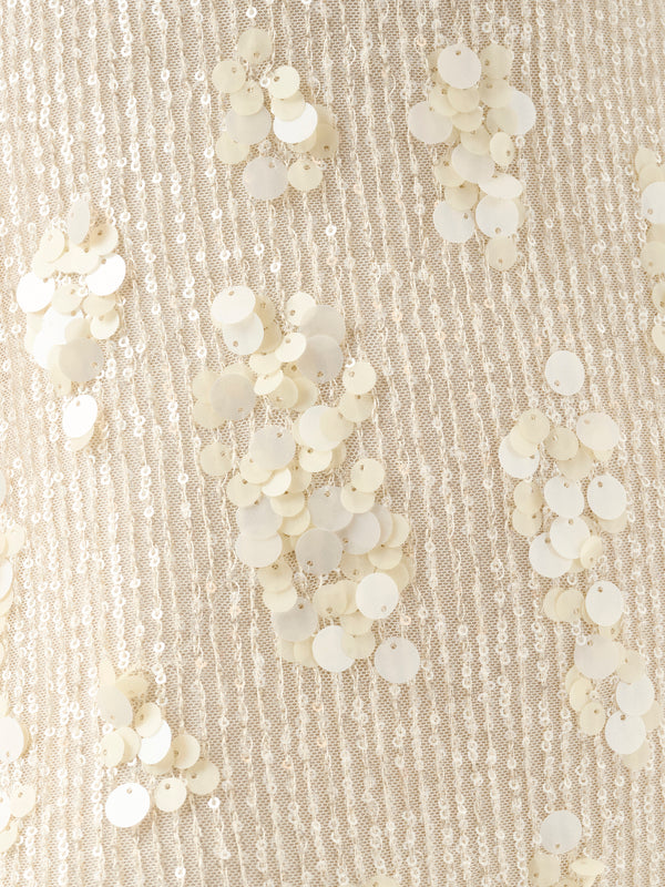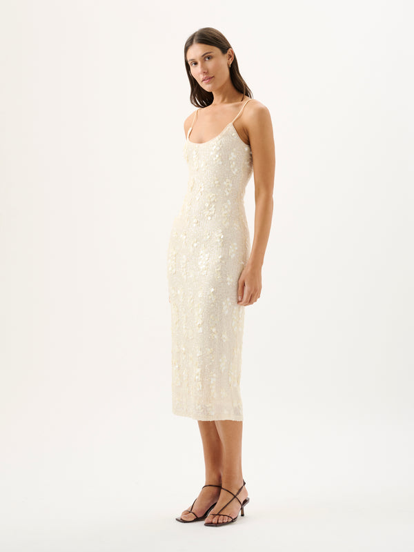 Radiate elegance in the Estella Dress, crafted in shimmering Ivory Sequin for an effortlessly glamorous look. Featuring delicate, fine straps and a soft scoop neckline, this flattering midi-length silhouette is designed for your Spring occasions.