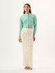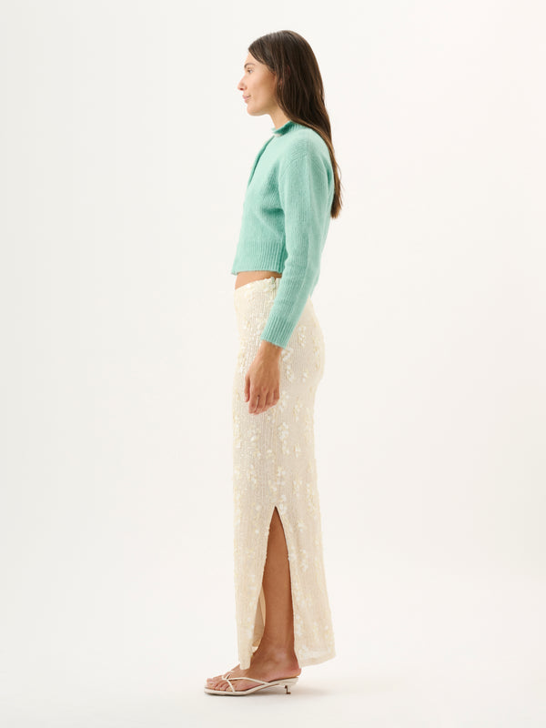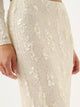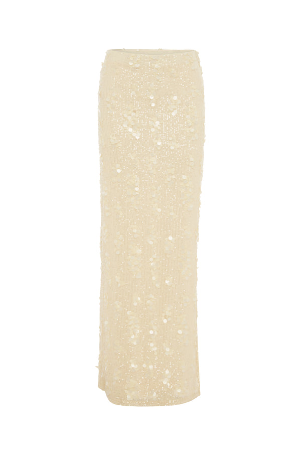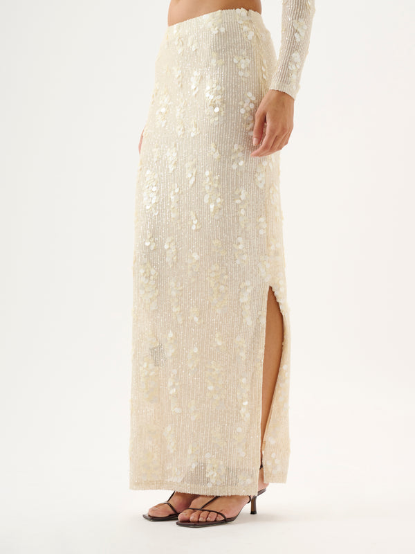 The Yves Skirt in Ivory Sequin, a lined silhouette featuring a flattering side split and an invisible side zip for a seamless finish. Effortlessly refined, it pairs perfectly with the coordinating Carmine Top or stands alone to elevate any look.