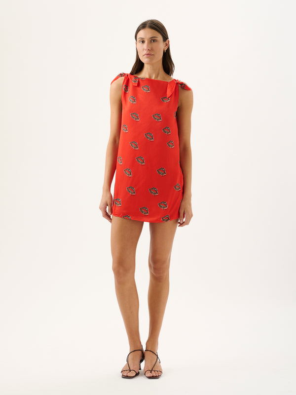 Rendered in the bespoke Jungle Kiss print, the Agatha Dress offers a silhouette that is effortless and versatile for warm weather occasions. Finished with tie sleeves and a mini silhouette style the Agatha Dress with a simple sandal or heel.